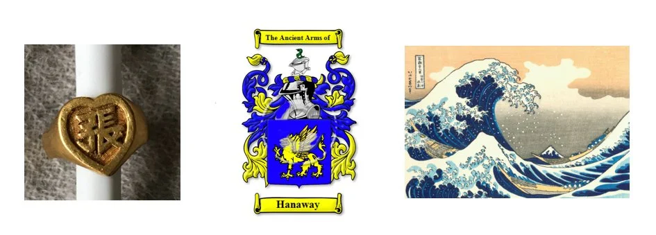Above L: A solid gold ring with the kanji for Chang, my last name, that my parents had given me when I was 10. This was one of the pieces that was melted down to create the new rings. Above M: The Hanway crest. Above R: The “Great Wave of Kanagawa” by the Japanese artist Hokusai.